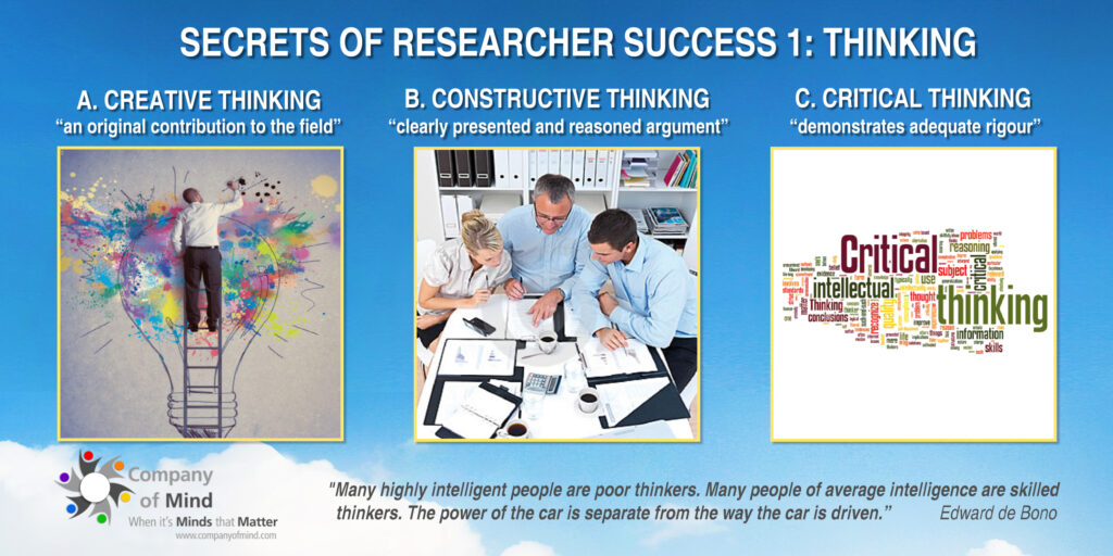 Research is about thinking – without thinking, there is no research. Your work is largely judged on the quality of your thinking. Yet “how to think” is rarely part of our formal studies.